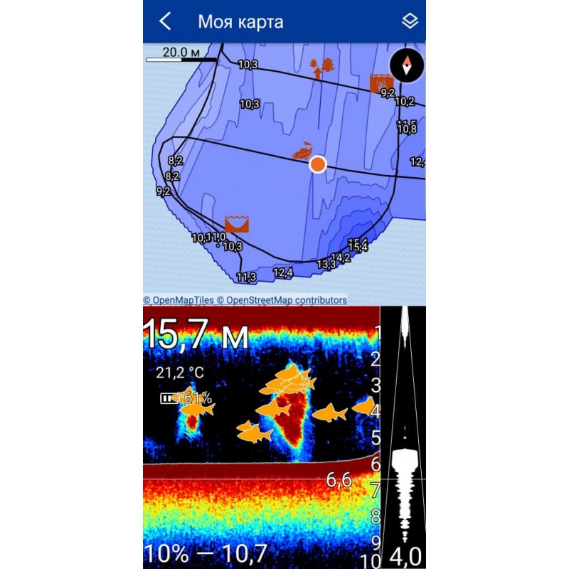 Картография (доступна при работе со смартфоном): запись карт глубин, сохранение интересных мест, построение маршрутов, редактирование записанных файлов.