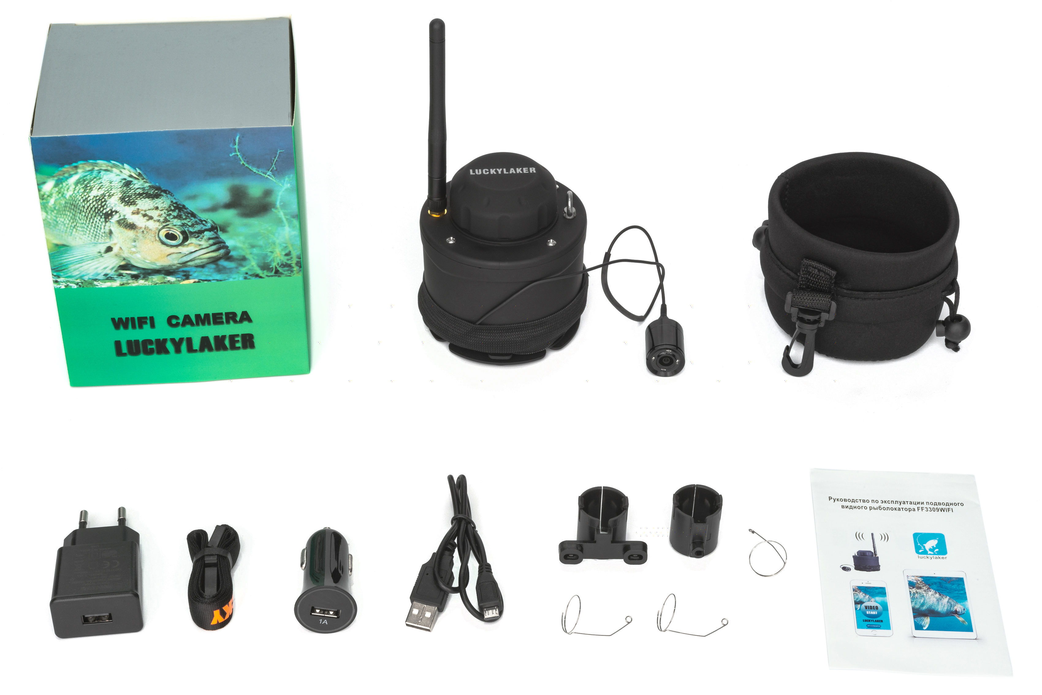 Подводная видеокамера Lucky FF3309 Wi-Fi — беспроводная подводная wifi камера для рыбалки. Lucky FF3309, как и предыдущая модификация подводная видеокамера для рыбалки Lucky FF3308 имеет прочный длинный гибкий кабель с кевларовой нитью внутри, инфракрасную подсветку. Но в отличии от предыдущей модификации камера для рыбалки Lucky FF3309 способна получать видео сигнал с помощью wi-fi связи вашего планшета или телефона на Android или IOS. Такая видеокамера для рыбалки делает ее спектр применения более широким. Например можно в одну лунку установить подводную камеру и отправиться исследовать другие при этом держать под контролем наличие рыбы в первой лунке.