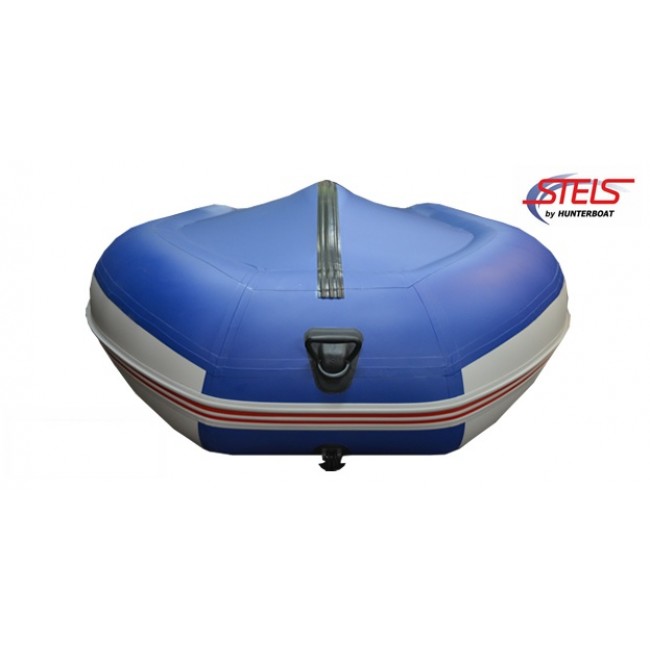 Надувная лодка СТЕЛС 295 изготовлена и ПВХ ткани плотностью 950 гр/м.кв., и представлена в современном дизайне и комбинированном сине/белом цвете.