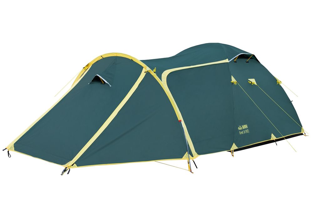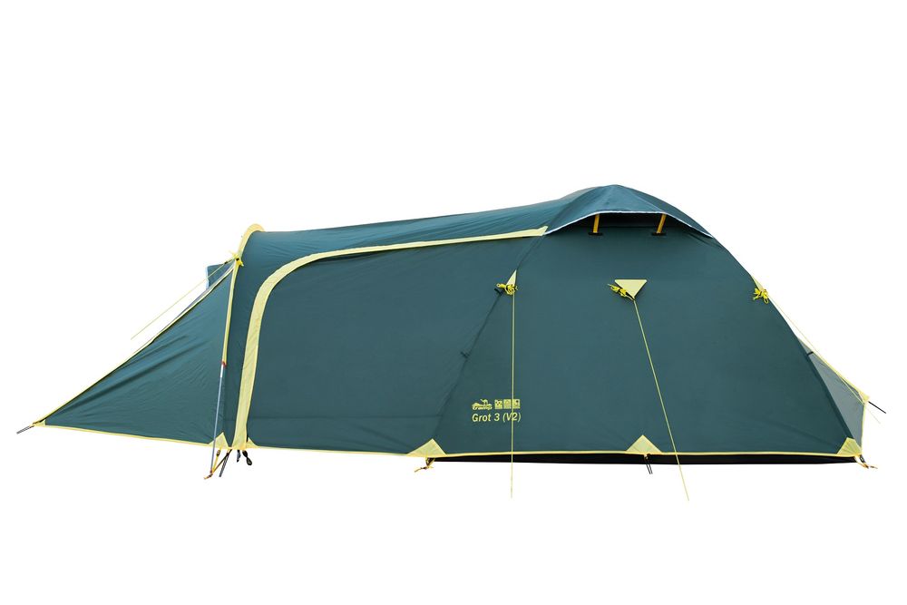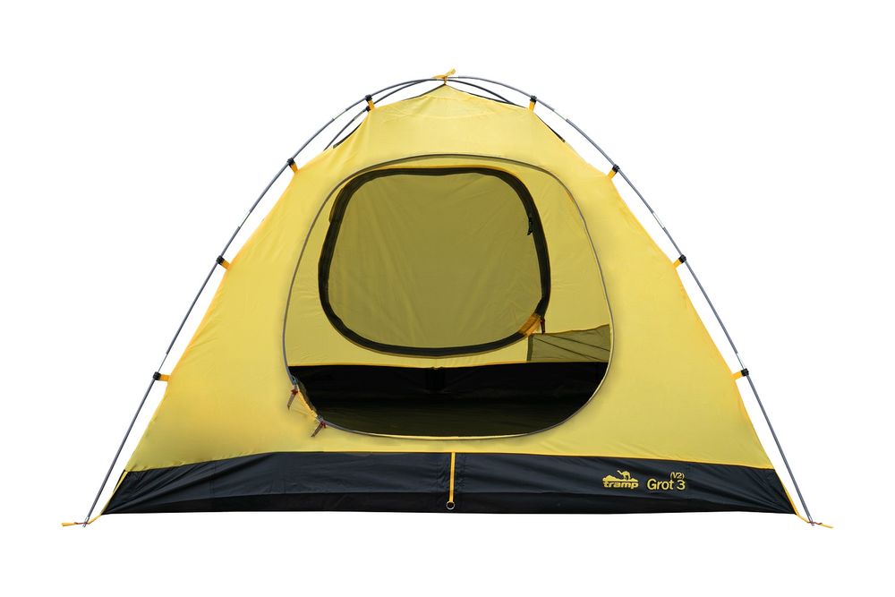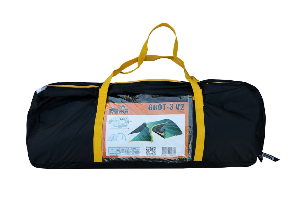 Палатка TRAMP GROT 3 (V2) - туристическая походная модель для установки лагеря: весной, летом, осенью. Дана продукция пользуется большим спросом и популярностью среди поклонников пеших походов и велосипедных путешествий. Также очень известна среди мотоциклистов и охотников. Штатно рассчитана на три человека, хотя могут быть размещены и 4 туриста. Палатка имеет внешний тент, два отдельных входа, оборудован съемным полом. В наличии имеются стальные колышки, с расчетом на всю палатку и на штормовые растяжки. Конструкция - обтекаемая "полусфера" с отдельной дугой для тамбура.