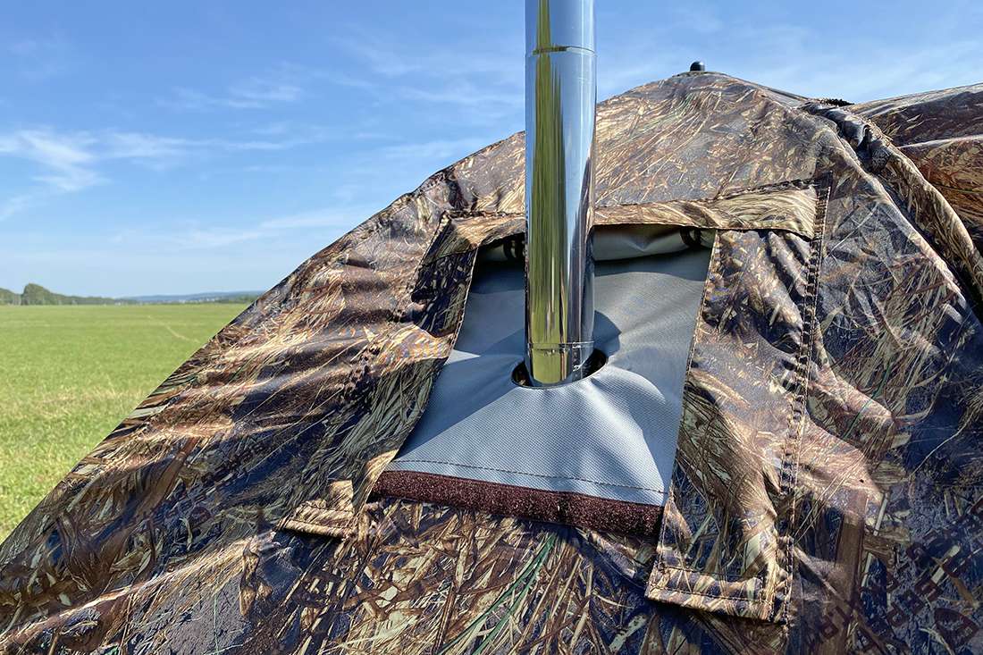 Дополнительный приток воздуха, при использовании походной печи, обеспечивается вентиляционным окном в нижней части палатки.