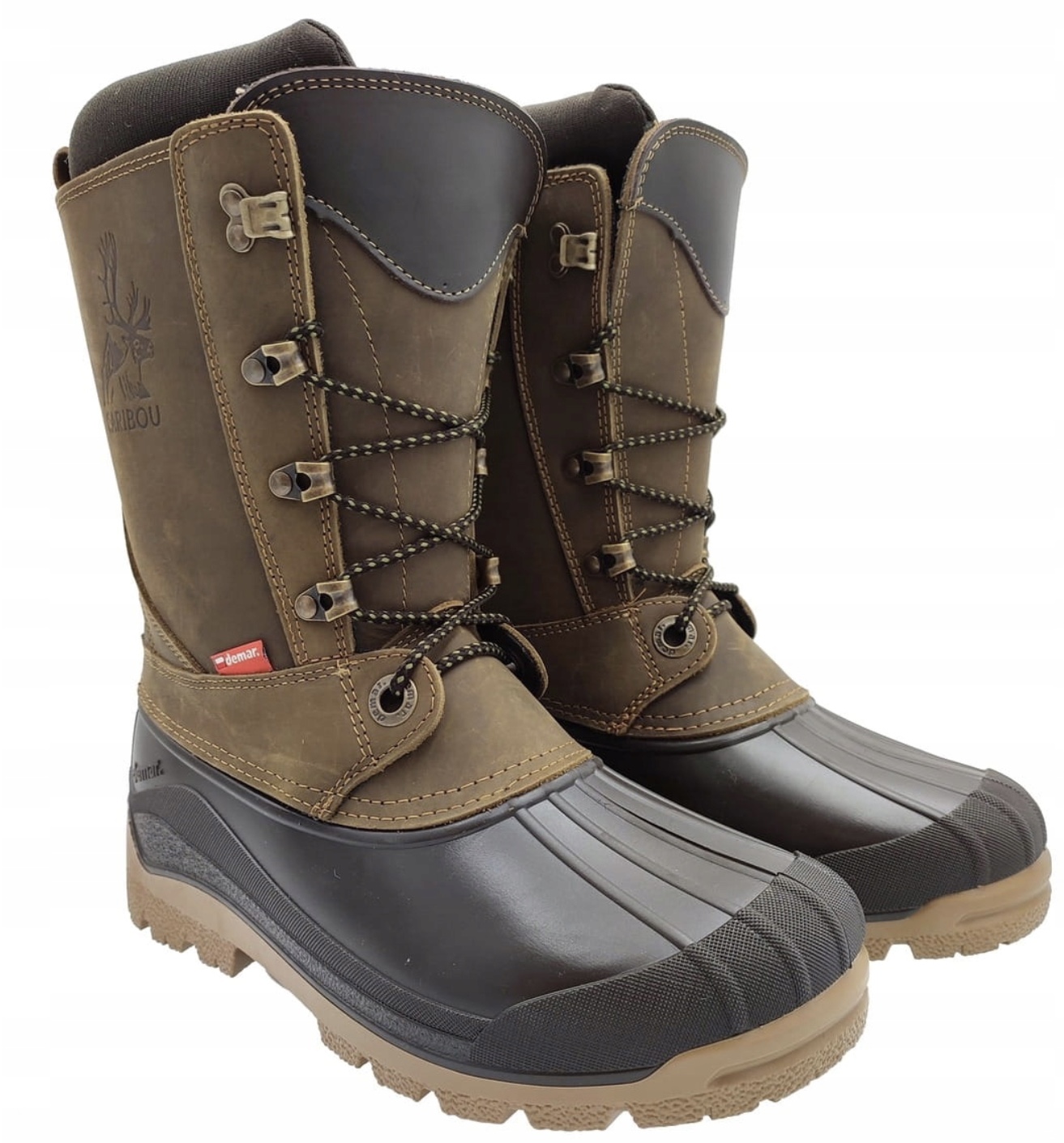 Верх сапог DEMAR Caribou Pro изготовлен из толстой и прочной натуральной кожи - нубук с водоотталкивающей пропиткой. Двойной шов обеспечит прочность всех элементов декора и дизайна, с длительным использованием сапог. Модель подойдет на любую ногу, а с помощью крепких шнурков которые проходят через восемь закрытых и два открытых металлических кольца, Вы идеально зафиксируете их на ноге, а также позаботитесь чтобы внутрь сапог не попадали влага, холод и грязь. Низ обуви выполнен из прочного и толстого термокаучуку.
