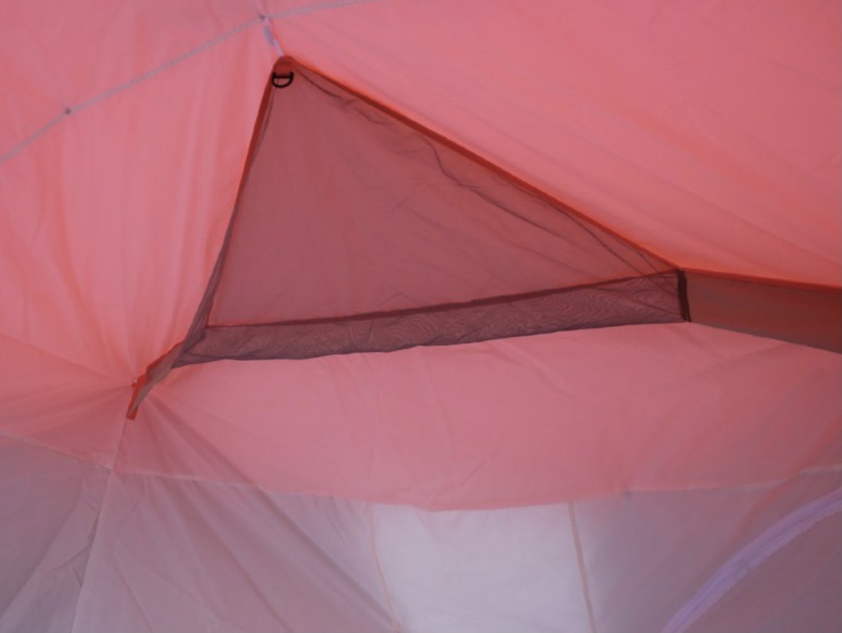 -Несколько регулируемых вентиляционных окон: одно затягивающееся окно под куполом, одно окно сбоку крыши на молнии, нижняя вентиляция для обеспечения конвекции воздуха. Верхняя и нижняя вентиляция снабжены рукавами которые соединяют наружный и внутренний тент таким образом чтобы воздух вентилировался внутри палатки, а не в теплой воздушной подушке между наружным и внутренним тентом. Все вентиляционные окна снабжены защитными клапанами.
