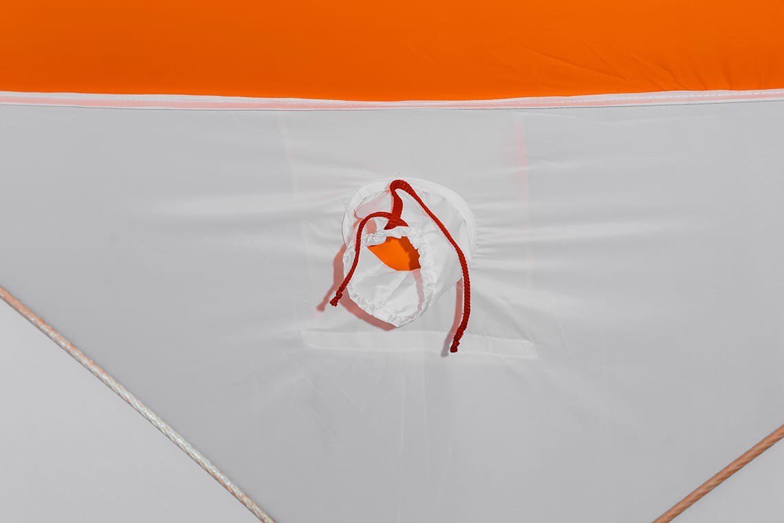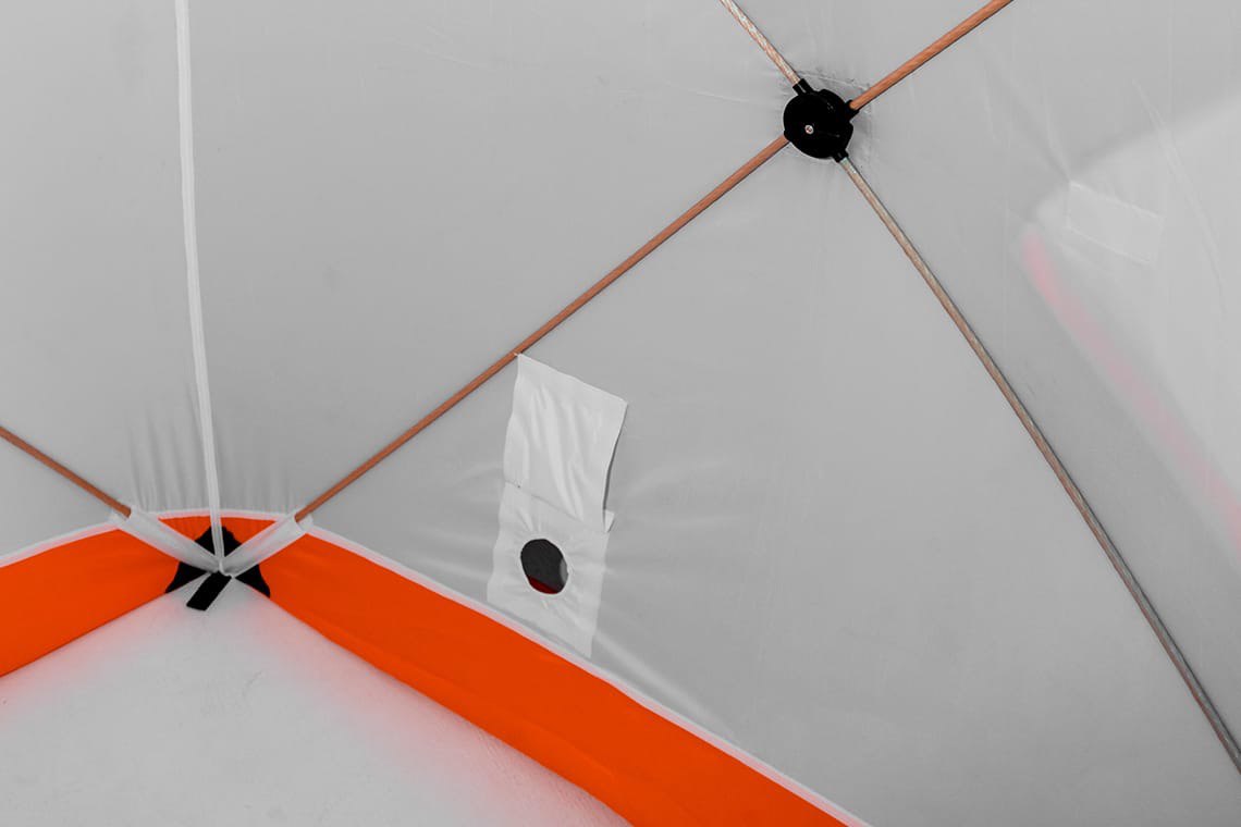 Палатка имеет выход под различные диаметры труб для использования отопительных приборов, окошко для притока воздуха и дополнительное окно на молнии и липучках для дополнительного проветривания или дополнительного света и обзора.